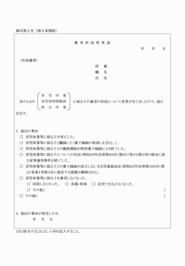 第8条 育児休業をしている職員は、次の各号のいずれかに該当する場合には、遅滞なく、その旨を任命権者に届け出なければならない。